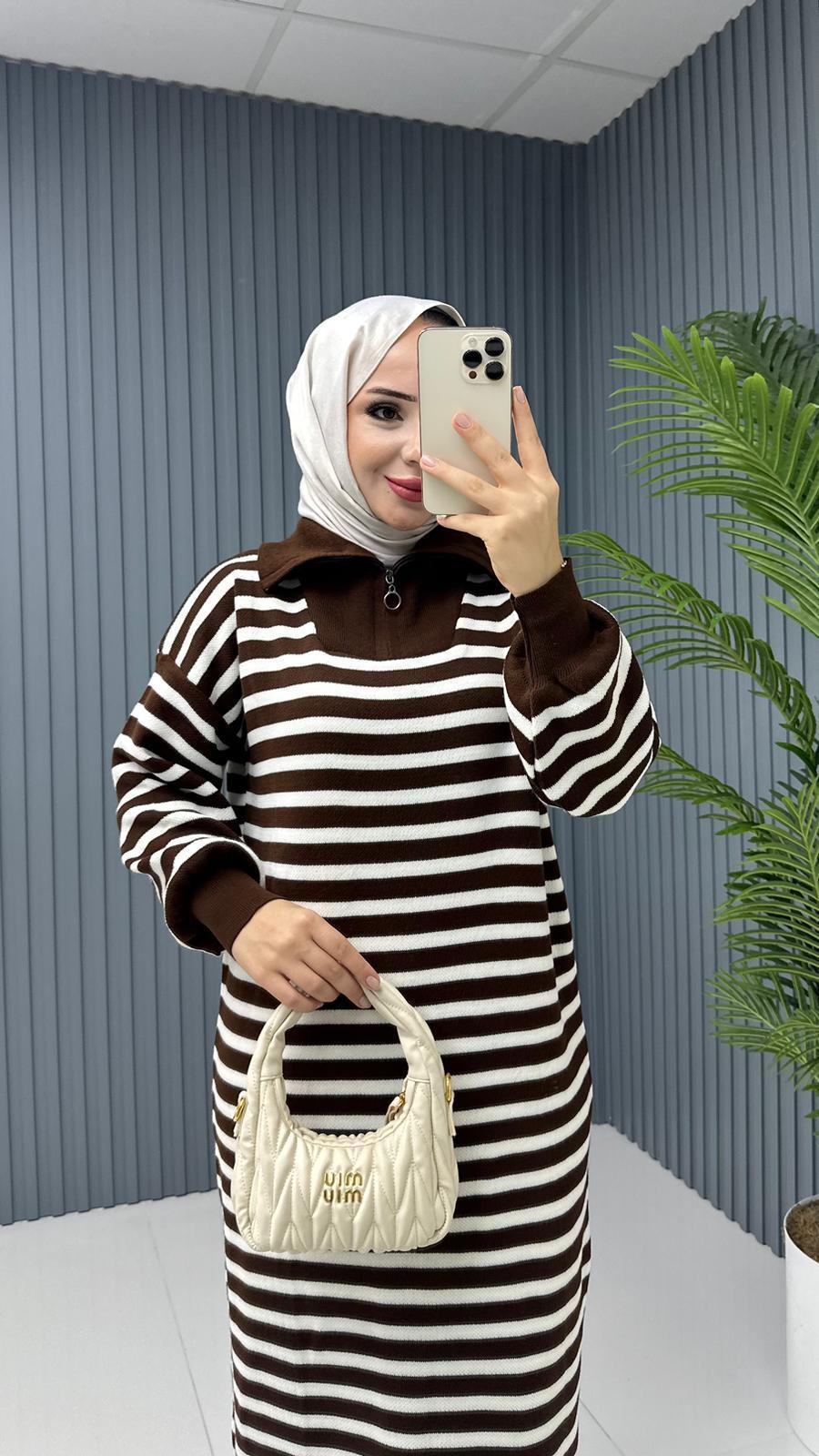 Modern çizgileriyle dikkat çeken bu triko elbise, hem günlük kullanımda hem özel günlerde stilinizi tamamlayacak ideal bir parça. Yumuşak dokulu triko kumaşı sayesinde gün boyu konfor sunarken, yatay çizgili tasarımıyla sade ama etkileyici bir görünüm sağlar.